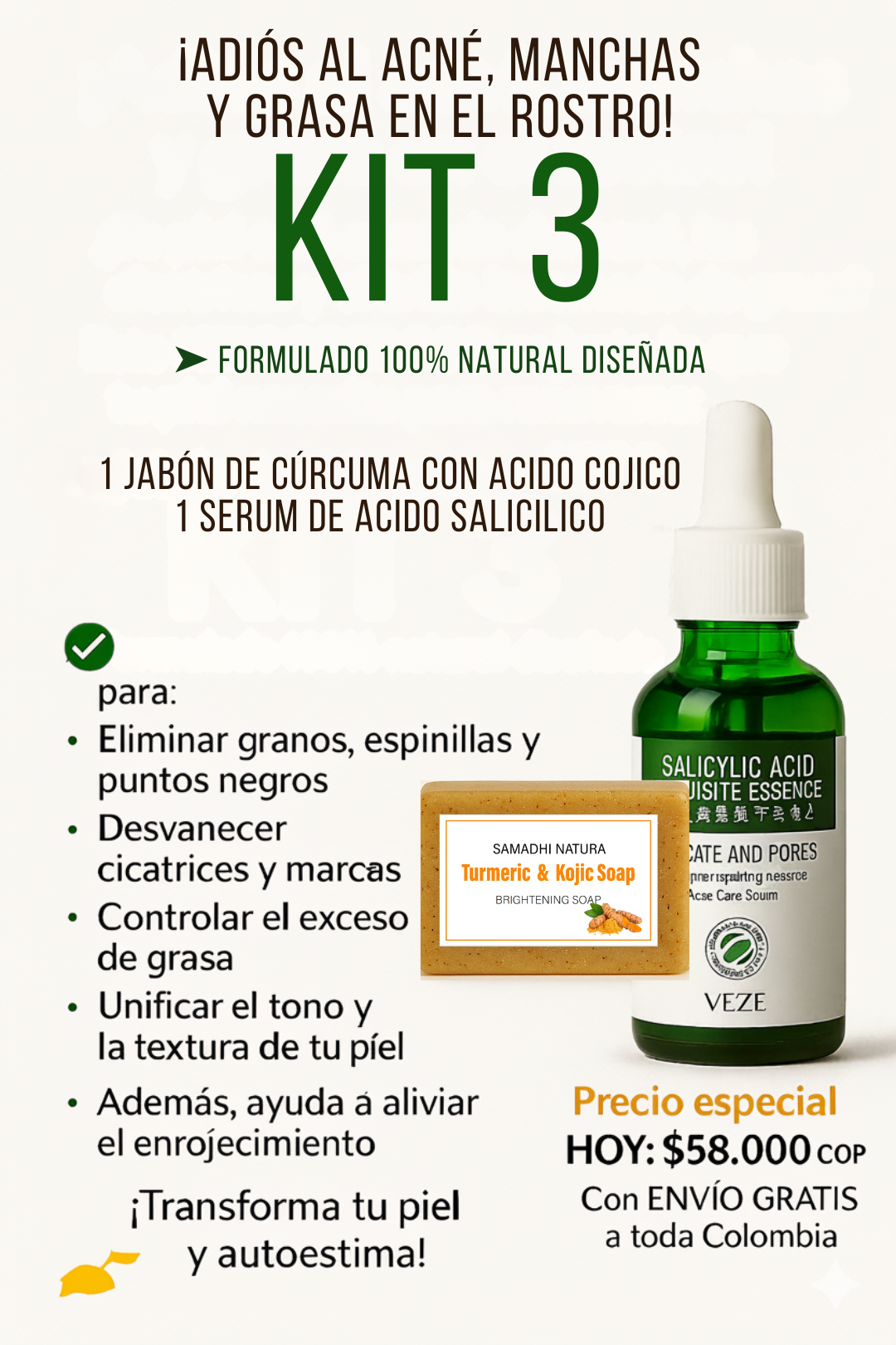 💬 Claro que sí. El jabón y el sérum con ácido salicílico limpian a profundidad, desinflaman los brotes y controlan la producción de grasa en la piel.