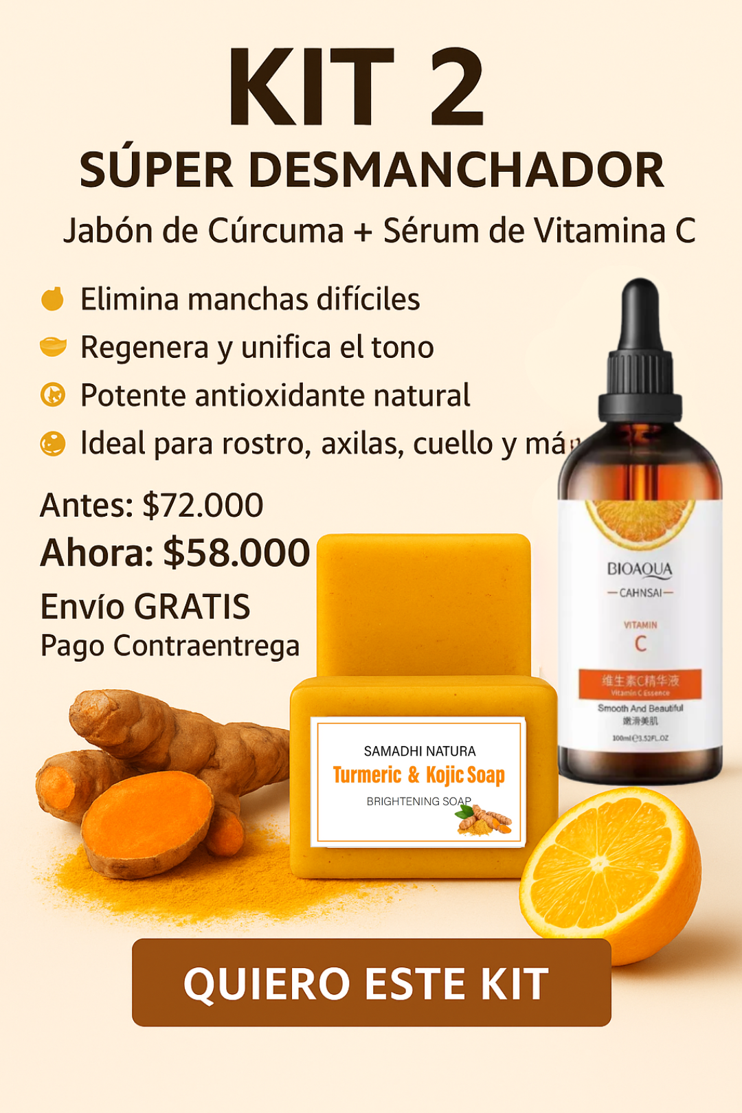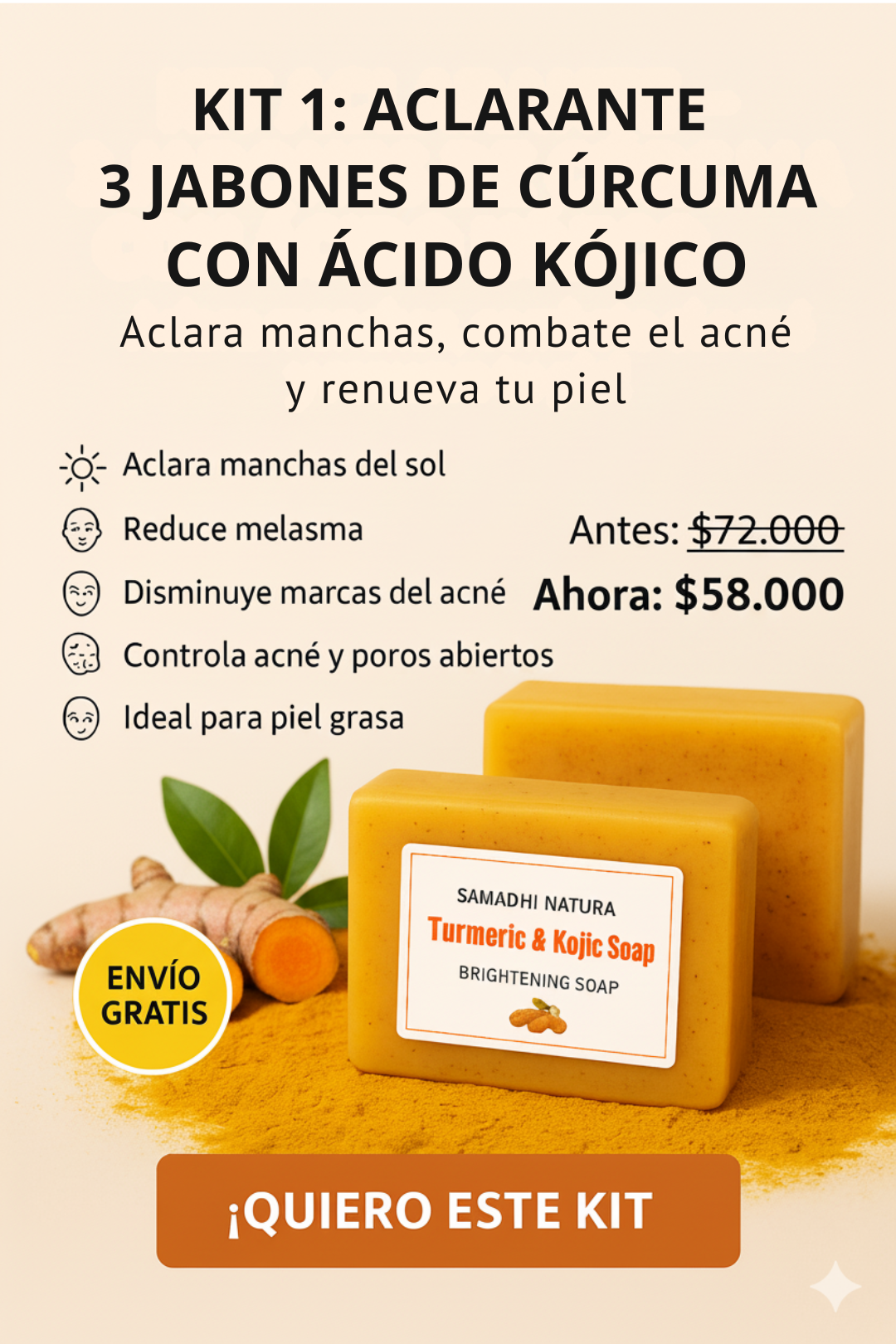 💬 ¡Sí! La cúrcuma y el ácido kójico actúan como despigmentantes naturales. El sérum de vitamina C potencia aún más los resultados en melasma, manchas del embarazo y daño solar.