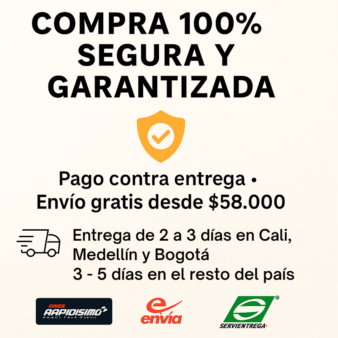 🚚 El envío se hace por Envia / interrapidisimo . Llega en 2–3 días en ciudades principales y 3–5 días en zonas rurales. Puedes pagar contraentrega. se puede recoger en oficina.